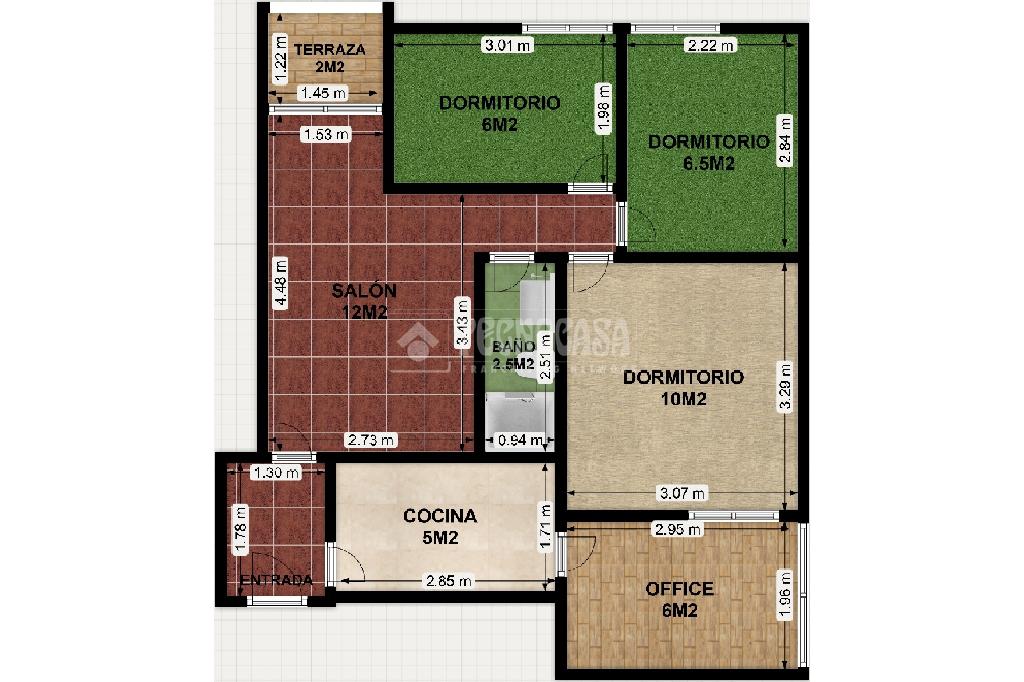 La vivienda se distribuye de la siguiente manera: SALÓN de paso con acceso a pequeña TERRAZA, COCINA con acceso a OFFICE, TRES DORMITORIOS y BAÑO.