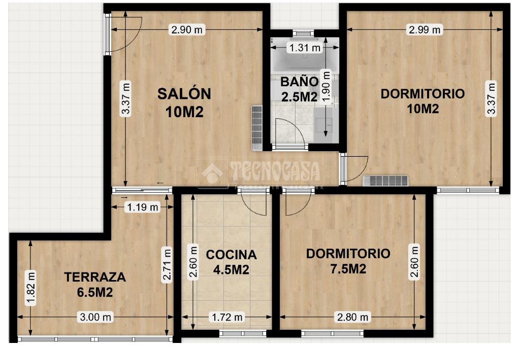 La vivienda se distribuye en salón de paso con acceso a terraza cerrada, cocina, DOS dormitorios y un cuarto de baño equipado con bañera.