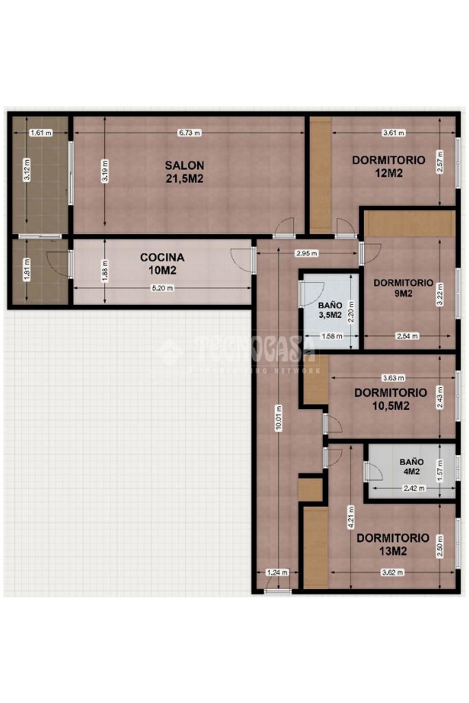 La vivienda se distribuye en salón independiente con salida a TERRAZA ABIERTA; cocina de 10m2 con tendedero anexo cerrado; 4 amplios dormitorios, todos ellos equipados con armario empotrado y 2 cuartos de baño, uno de ellos situado en suite principal.